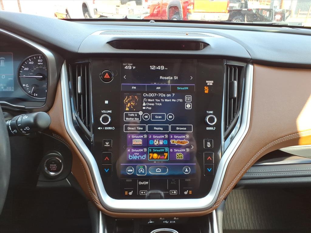 This vehicle is a 2021 Subaru Outback Touring XT with an all-wheel drive system and a 2.4 liter Turbo H4 260hp 277 lb-ft engine. It has a fuel economy of 23 mpg in the city and 30 mpg on the highway, making it an efficient choice for those who need to travel long distances. It also has a crash test rating of 5 out of 5 stars, which is impressive for any vehicle. This car also comes with a number of features such as touch screen display, Bluetooth audio connection, blind spot sensor, hill start assist, center console with faux leather trim, full time four wheel drive, Apple Carplay ready, navigation system with voice recognition, and Bluetooth phone connectivity. All of these features come together to make this car an excellent choice for anyone looking for a reliable and efficient vehicle.